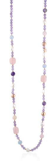 COLLANA CON PERLE FW, AMETISTA, AGATA ROSA, ACQUAMARINA MILK ED ELEMENTI IN ARGENTO.