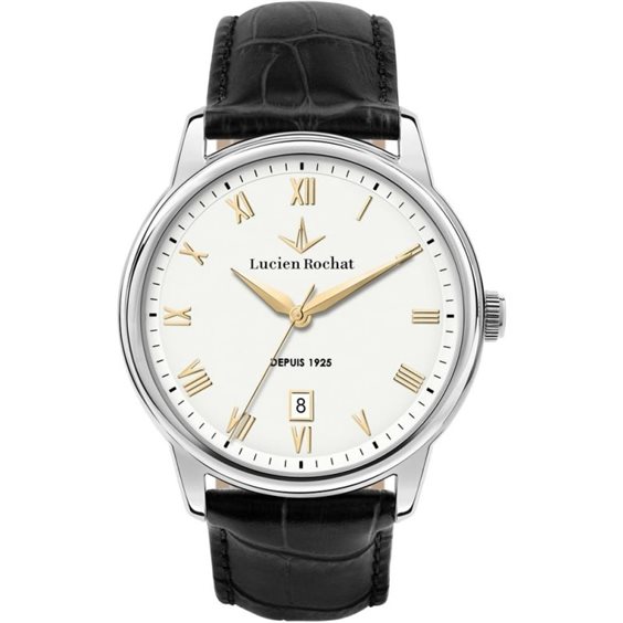 Orologio Lucien Rochat uomo. Funzione tempo e data. Orologio in acciaio con cassa di 42 mm. Quadrante bianco, Cinturino in pelle nero. Chiusura con fibbia ardiglione. Impermeabilità fino a 3 ATM.