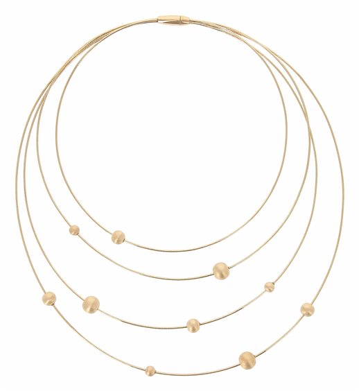 COLLANA DNA SPRING IN ARGENTO DORATO A 4 FILI DI DIVERSE LUNGHEZZE CON 10 PALLINE SATINATE VARIE DIMENSIONI SFALZATE.