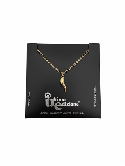 Ciondolo realizzato in argento 925°/oo con catena rolo’ e doppia chiusura regolabile CM. 42 / CM. 40 Pendente cornetto porta fortuna versione Small 18 mm (contromaglia compresa ) Disponibile nella versione Rodiata oppure placcata oro giallo 18 Kt. Perfetto come idea regalo .