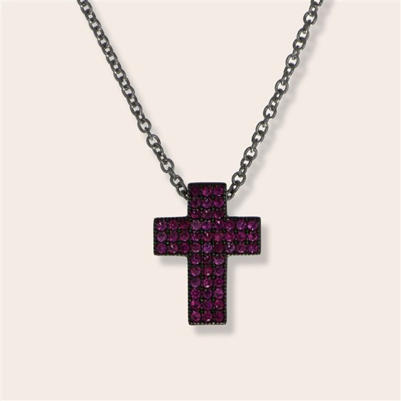 Catena Rolo’ classica cm. 42 regolabile fino a cm. 40 ,con pendente a croce Pave’ zirconi colorati incassati effetto “invisible settings” su base in argento 925°/oo brunita . disponibile nelle varianti pave’ : nero , verde smeraldo , blu zaffiro oppure rosso rubino dimensioni : 12×15 mm.