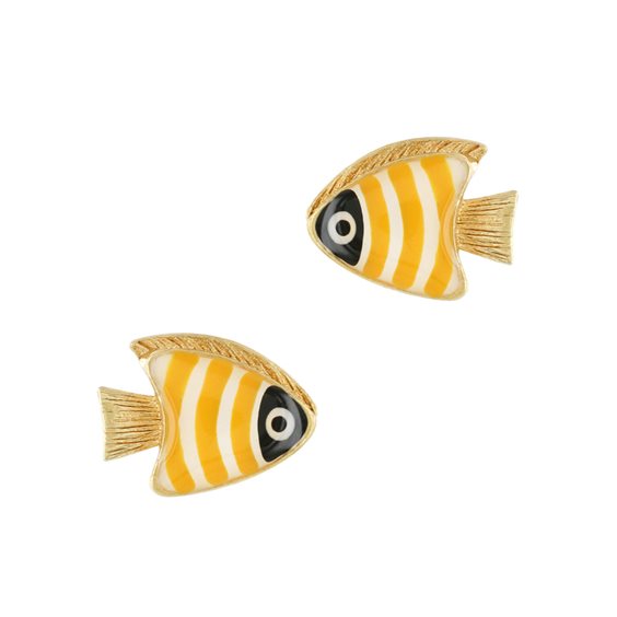 Collezione : Primavera / Estate 2023 Tema : Pacific Superficie : Colore dorato Colore : Giallo Composizione : Metallo, resine colorate i cui motivi sono dipinti a mano Dimensione : Altezza 1cm, peso 1g